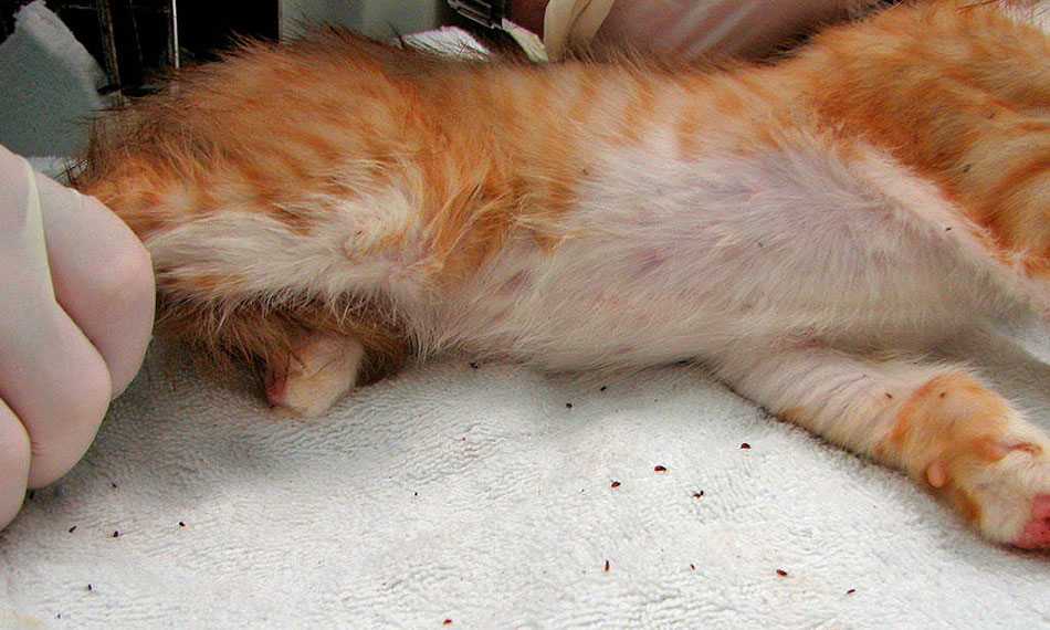 Кроме того, на подшерстке животного можно заметить следы жизнедеятельности насекомых – экскременты, напоминающие черные песчинки, а на коже – расчесы, ранки и струпья.