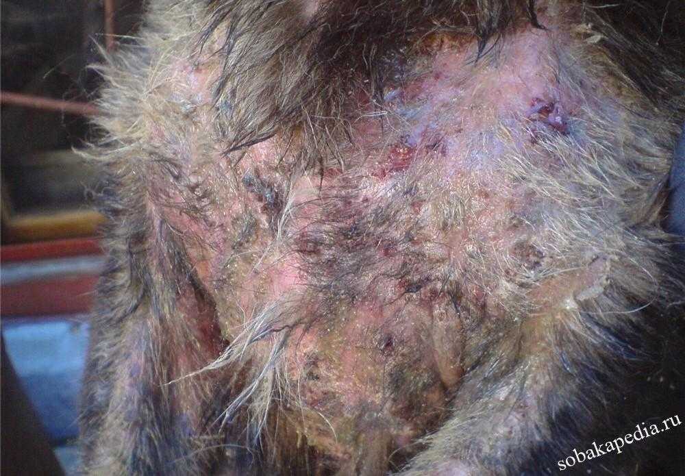Сухость, стянутость кожи, появление перхоти на шерсти сопровождается раздражением, появлением сыпи, покраснением пораженных участков.