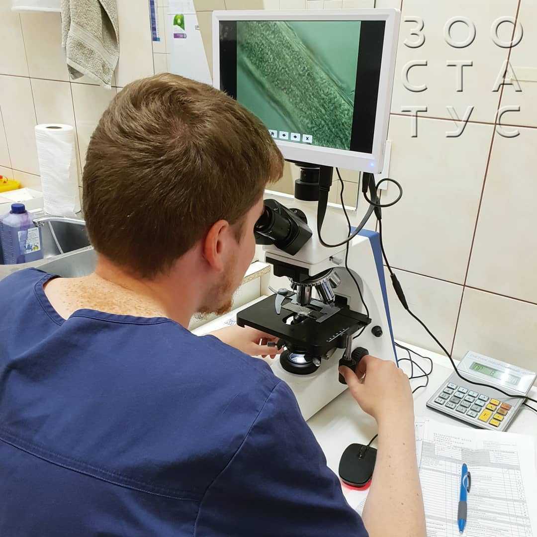 Грибок у собак подтверждается после сбора анамнеза, то есть всей важной информации об образе жизни, питании, симптомах питомца, проведения базового клинического обследования и специальных методов диагностики, инструментальных и лабораторных