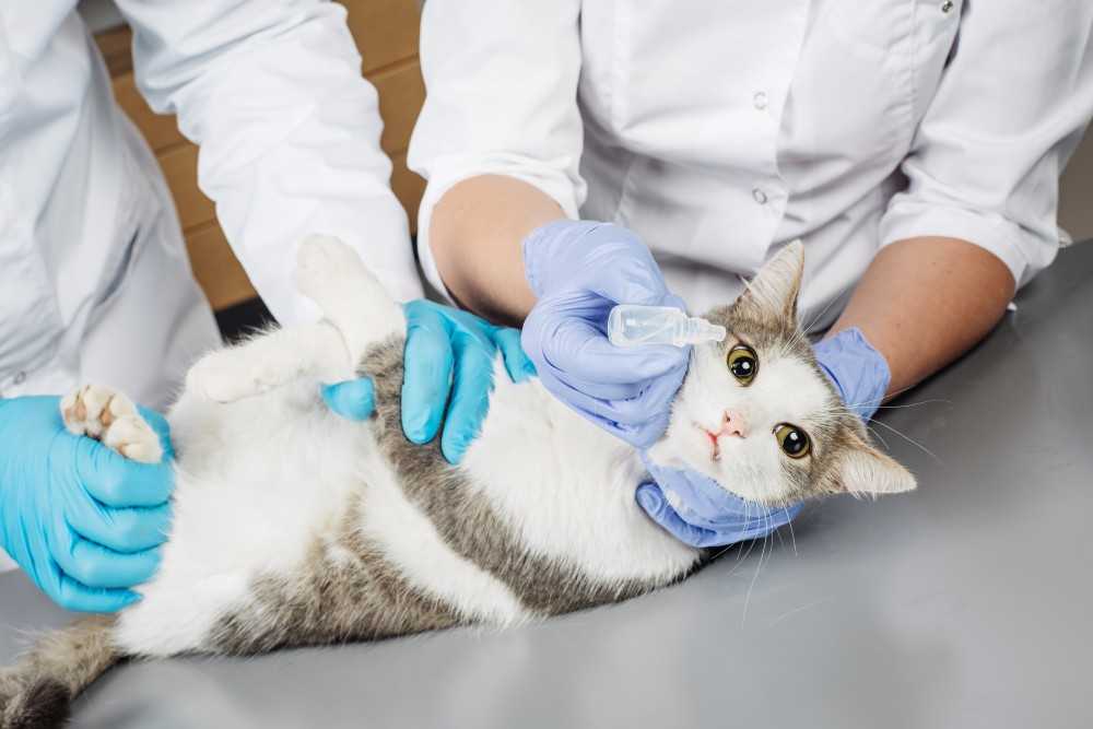 - оттянуть нижнее веко и закапать в глаз кошки 2-4 капли лекарства, если в инструкции не указана другая доза;