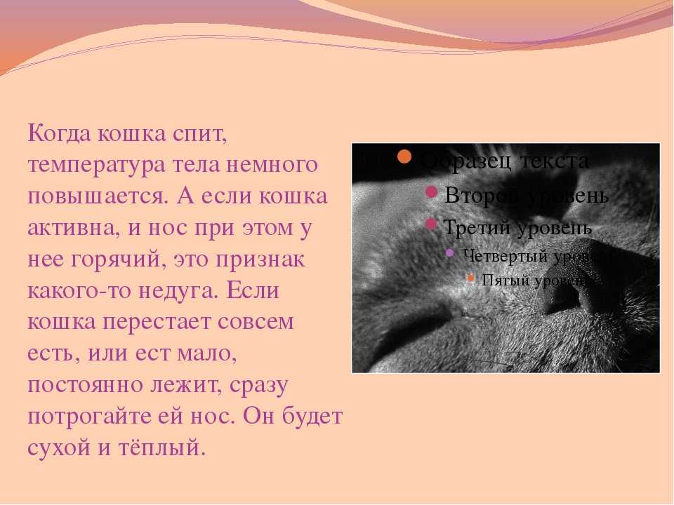 Что делать, если у кошки всё время сухой нос? Обратиться к ветеринарному врачу! Помните, что нормальная температура тела кошки не превышает 39,5 °C. По утрам и вечерам она может незначительно меняться: в утренние часы — быть ниже, а вечером — выше, и это нормально. Повышение температуры может увеличиваться после физических нагрузок, еды, во время жары, течки и беременности.