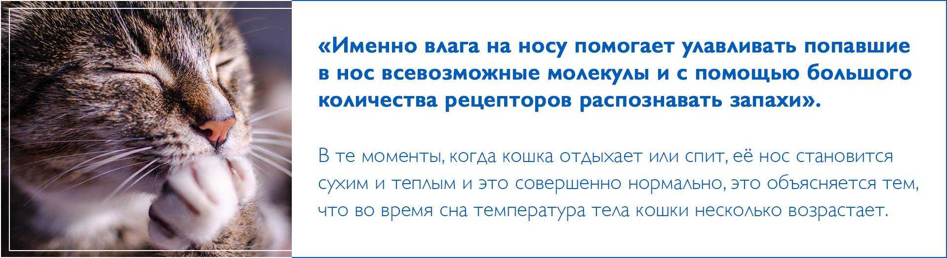 Какой нос у здоровой кошки — сухой и горячий или влажный и прохладный? Ветеринарные врачи считают, что нос должен быть прохладным и влажным. После сна или активной игры он может стать сухим на некоторое время, но затем быстро придет в норму.