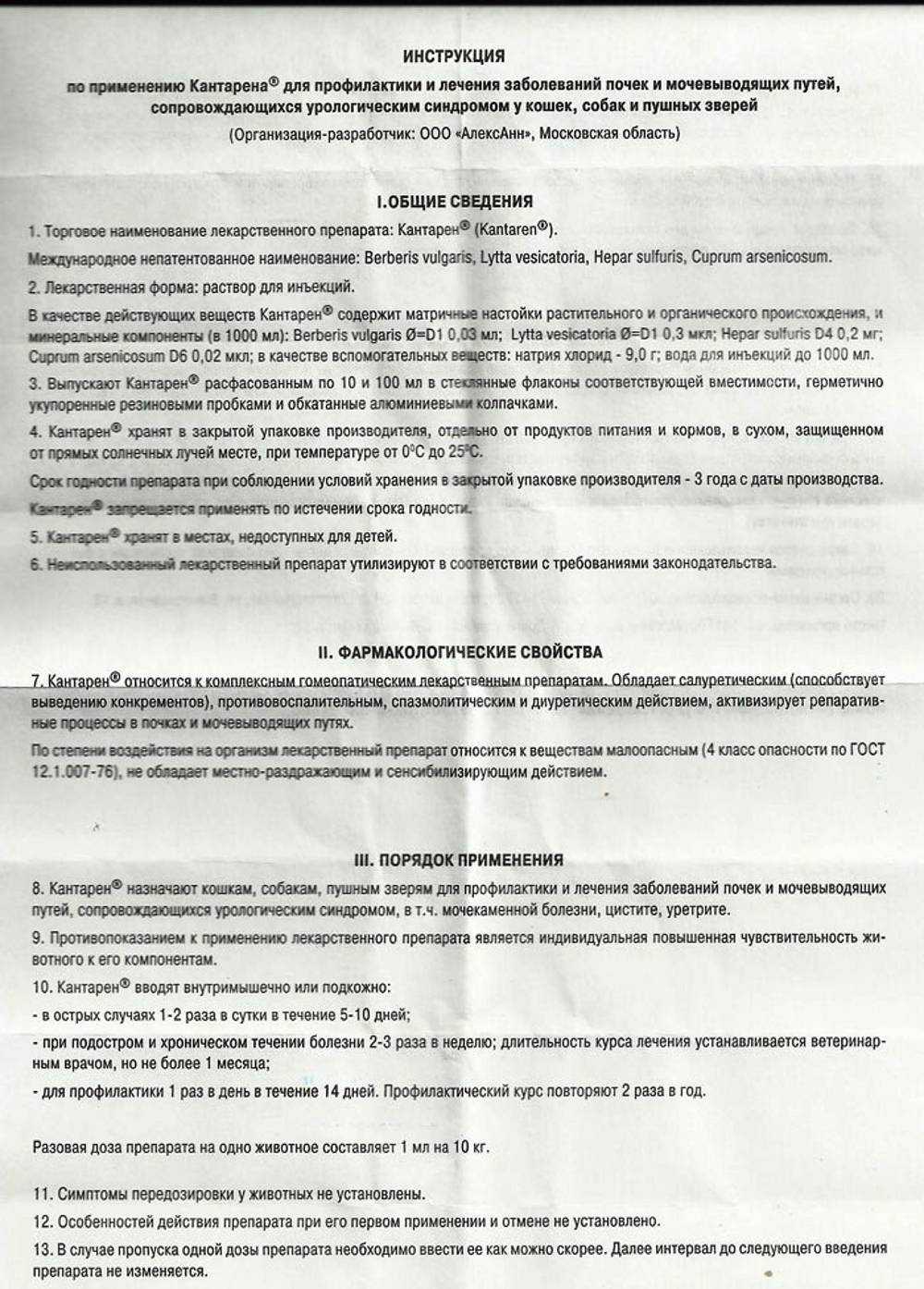 Лекарственный препарат Кантарен для собак и кошек выпускается как для проведения инъекций, так и в таблетках, он прекрасно обеспечивает восстановление проходимой функции мочеиспускательных каналов, помогает устранить воспалительные процессы, уничтожить болезнетворных микробов, нормализовать обменные процессы, повысить иммунитет. Обязательно во время лечения Кантареном, питомцу необходимо обеспечить сбалансированное питание и хороший уход.