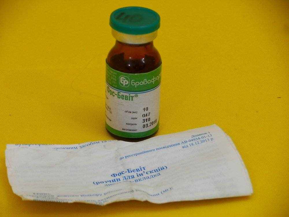 | Фос-бевит | Бутафосфан, витамины В3, В9 и В12 | Нипагин, апирогенная вода | 350 | ||||