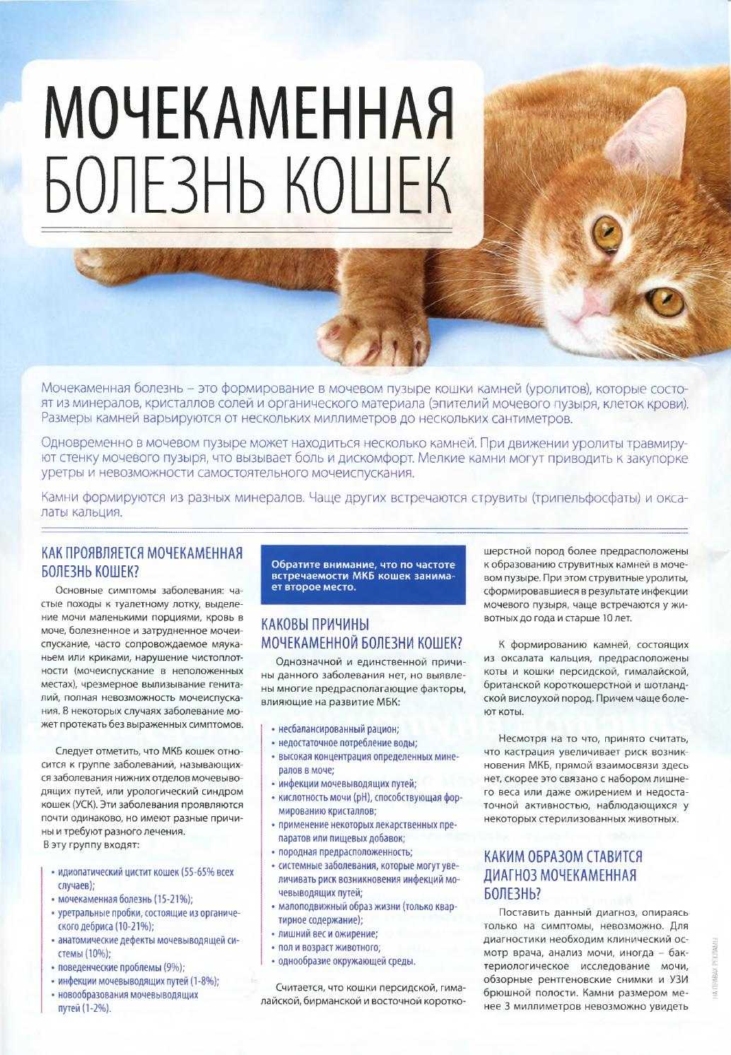 Следите, чтобы кошка потребляла достаточно чистой свежей воды, и если питомец мало пьёт, приобретите специальный фонтанчик, так как проточная привлекает животных больше. Внимательный и любящий владелец кошки, выполняя все рекомендации ветеринарного специалиста и находясь с ним в контакте, безусловно, поможет своему животному долгие годы оставаться здоровым и счастливым.