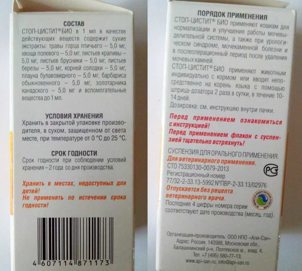 «Стоп-цистит» для кошек изготавливается российской компанией «Апи-Сан» с использованием вытяжек из лекарственных растений. Приставка «стоп» говорит о том, что медикамент направлен на эффективную борьбу с распространенной болезнью мочеполовой системы у кошек. Главные компоненты средства – нитроксолин и дротаверин. Вещества уничтожают грибки и бактерии, становящиеся причиной возникновения воспалительных заболеваний. Медикамент выпускается в форме таблеток и суспензии, во втором варианте к названию добавляется приставка «Био».