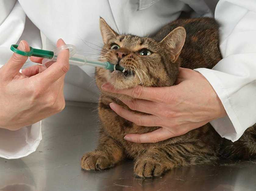 Следом шприц нужно аккуратно ввести в ротовую полость и постепенно выдавить суспензию. Голову животного понадобится 2—3 минуты подержать в приподнятом состоянии. Далее требуется погладить шею кота, чтобы стимулировать глотательный рефлекс