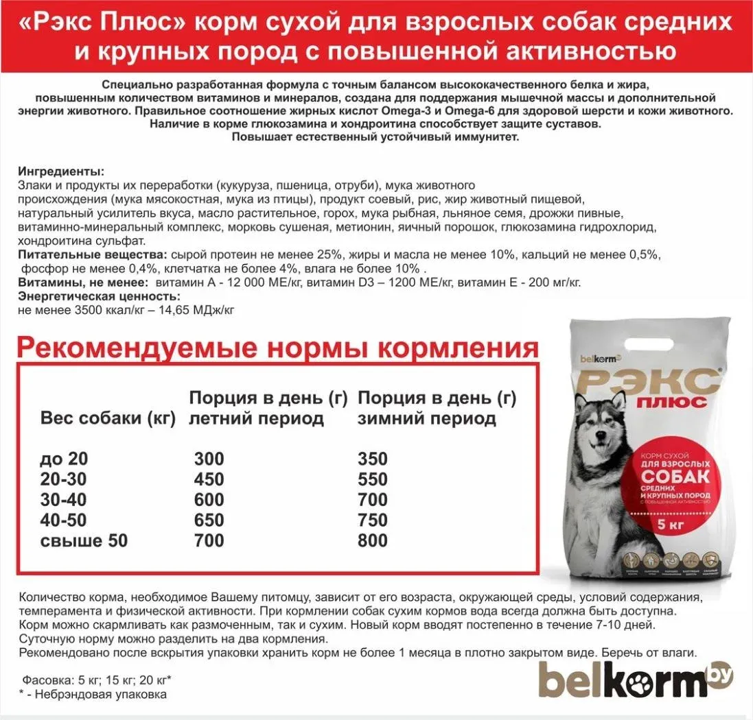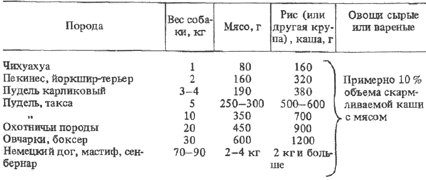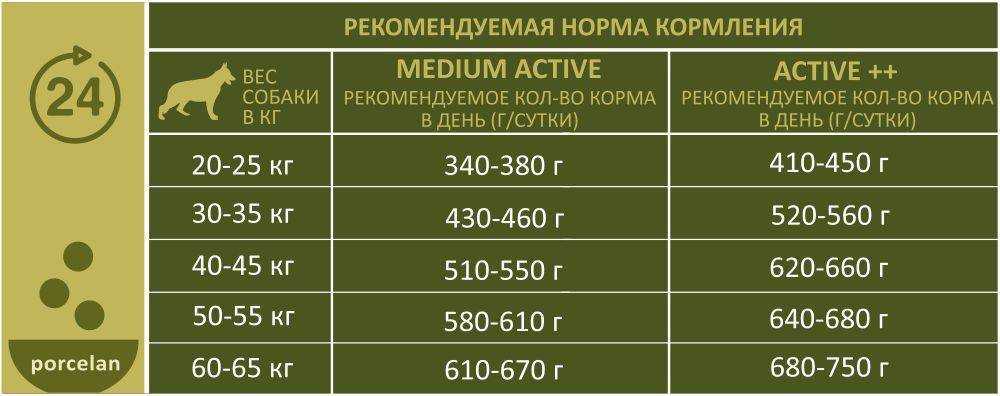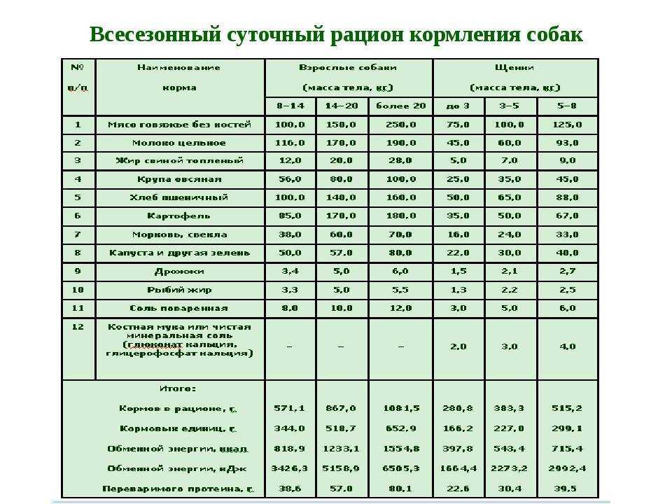Сводная таблица нормы корма разных видов для собак по возрасту и весу