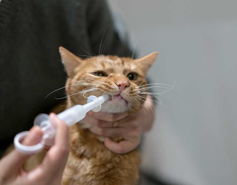Если животное не может само есть, его кормят жидкой пищей из шприца. В рацион больной кошки рекомендуется ввести молочные продукты, овощные бульоны, глюкозу. Жирную еду питомцу предлагать нельзя.