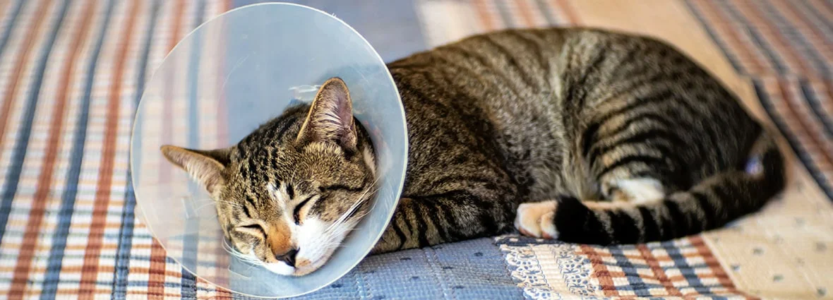 Первые трое суток питомца нельзя терять из виду. За процессом заживления нужно следить, не давать коту вылизывать рану. Иначе возможен занос инфекции и гнойное воспаление. Для предотвращения вылизывания надевают елизаветинский воротник. Швы обрабатывают средствами, которые порекомендует ветеринарный врач. Если кот быстро пришел в себя, раны не беспокоят, обрабатывать их лишний раз не следует.