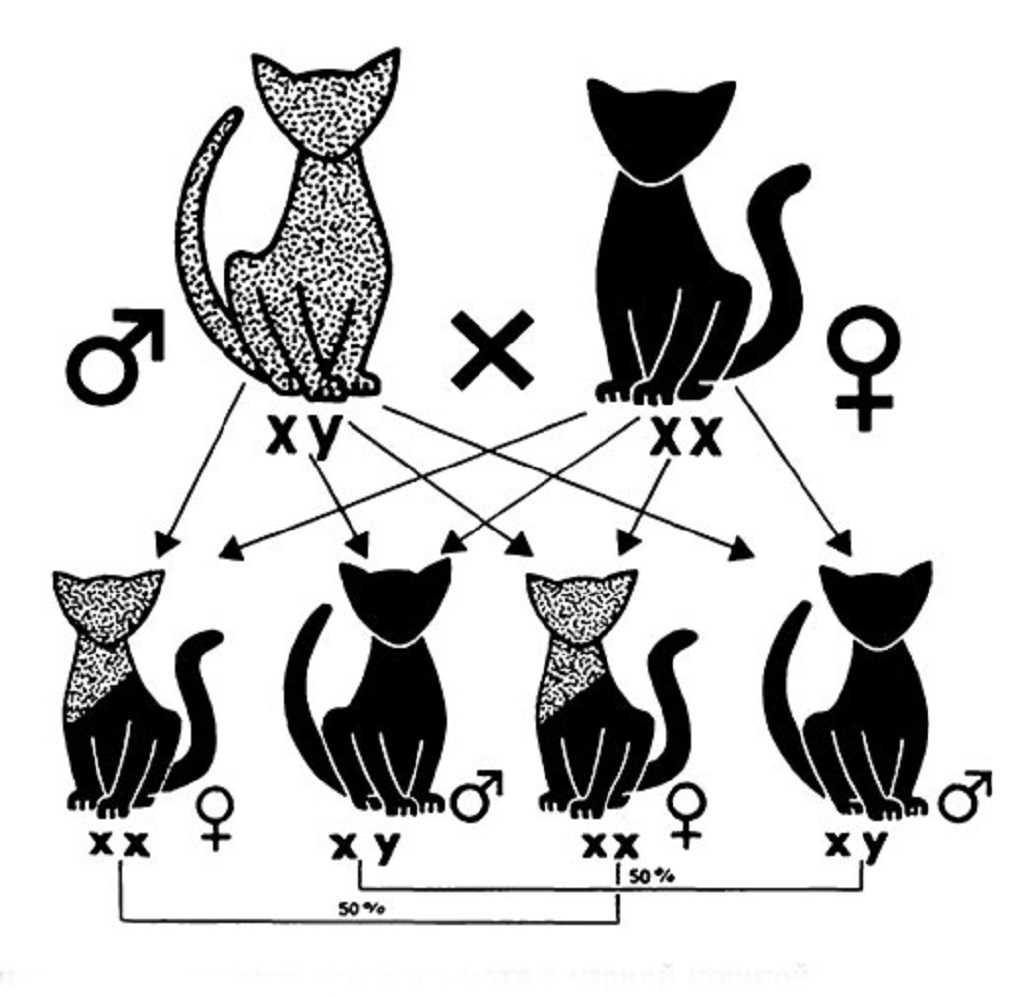 У кошек, как и других организмов, размножающихся половым путём, есть пара половых хромосом (XX). У котов она имеет вид XY, также как у большинства млекопитающих и человека. Их сочетание определяет пол котёнка. Кроме того, хромосомы отвечают за окраску. Гены передаются котятам по одному от кота и кошки. Один из них доминантный — более сильный и определяющий проявление своих признаков у котят. Другой — рецессивный, он угнетается доминантным. И когда сходятся два рецессивных — от кота и кошки, то получаются котята, не похожие ни на того, ни на другого.