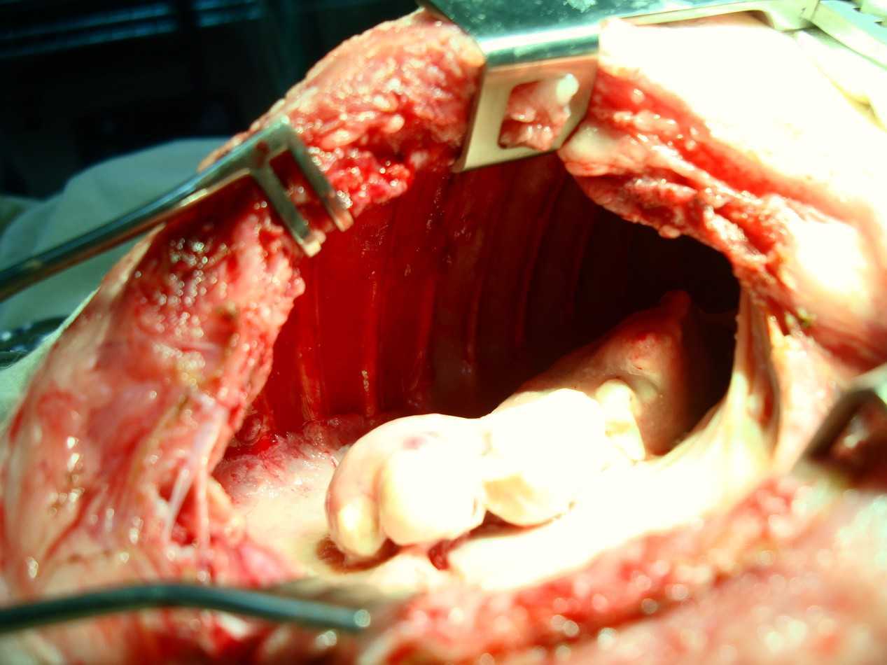 При наличии ущемленной грыжи рассекают грыжевой мешок и извлекают ущемленную кишку, если она отечна и гиперемирована, ее осторожно вправляют в брюшную полость. При затруднительном вправлении ветеринарный специалист скальпелем расширяет пупочное кольцо и только после этого вправляет кишку