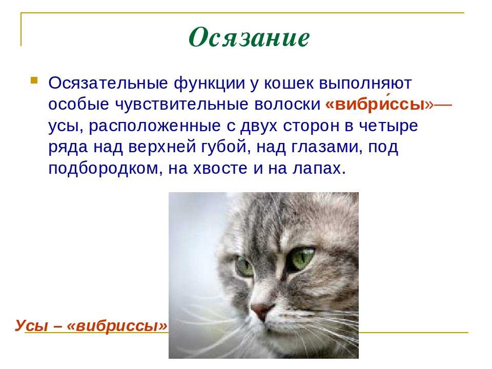 Ориентация в окружающем пространстве. Получая отражающие импульсы от предметов и стен, кошки отлично ориентируются даже в незнакомой обстановке. Анализируя изменения воздушного потока, животное получает информацию о преграде на ее пути.