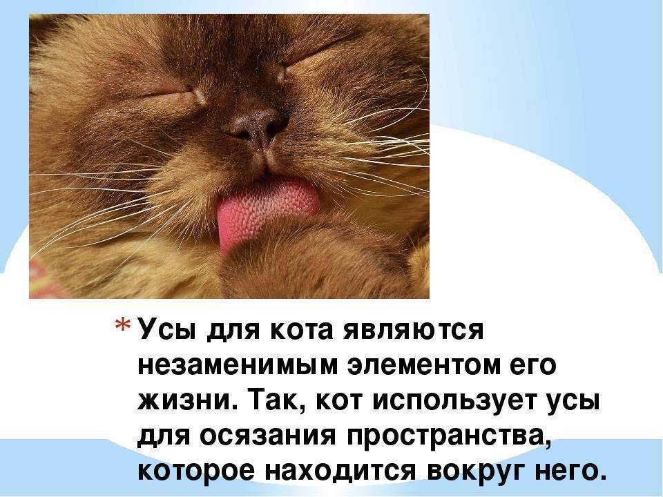 Ветеринары запрещают это делать, объясняя это тем, что животное на длительный период времени лишается важного органа обоняния и осязания. Вибриссы (вибрировать, дрожать) помогают ориентироваться на местности, быстро оценивать свои возможности как охотника. Благодаря усам даже слепая кошка безошибочно находит дорогу домой и никогда не остается без пищи