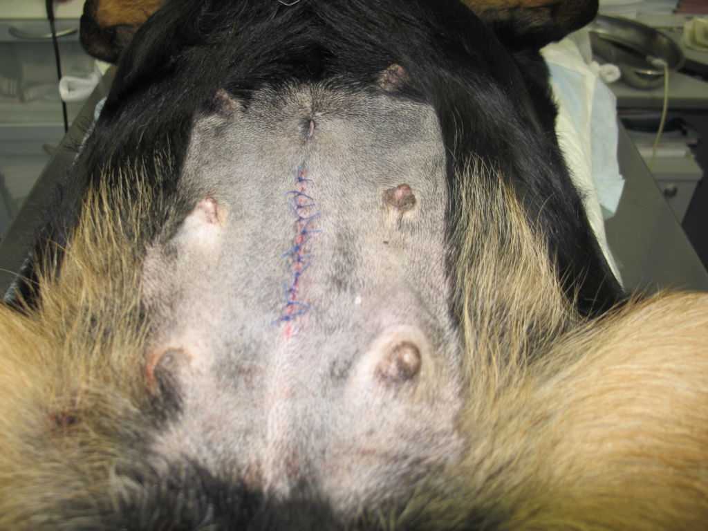 В течение двух недель требуется антисептическая обработка швов. Для избежания разлизывания швов собаке могут понадобиться воротник или попона.