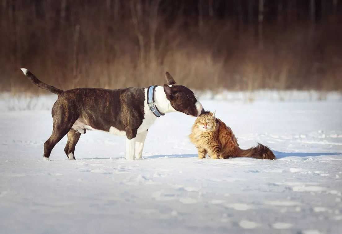 С другими животными, обитающими в доме, бультерьер будет дружить. Но это только в том случае, если они росли вместе. Однако за животными всё же нужно приглядывать и помнить о том, что бультерьер — собственник и ревнивец. Встречая на улице котов и собак, бультерьер запросто может кинуться в драку, видя в нём потенциальную добычу или врага. Причем размер противника для буля не важен.