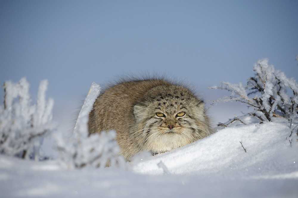 Выразительные глаза манула имеют желтый цвет. В отличие от домашней кошки зрачки этого кота не сужаются при ярком свете, а всегда остаются круглыми.