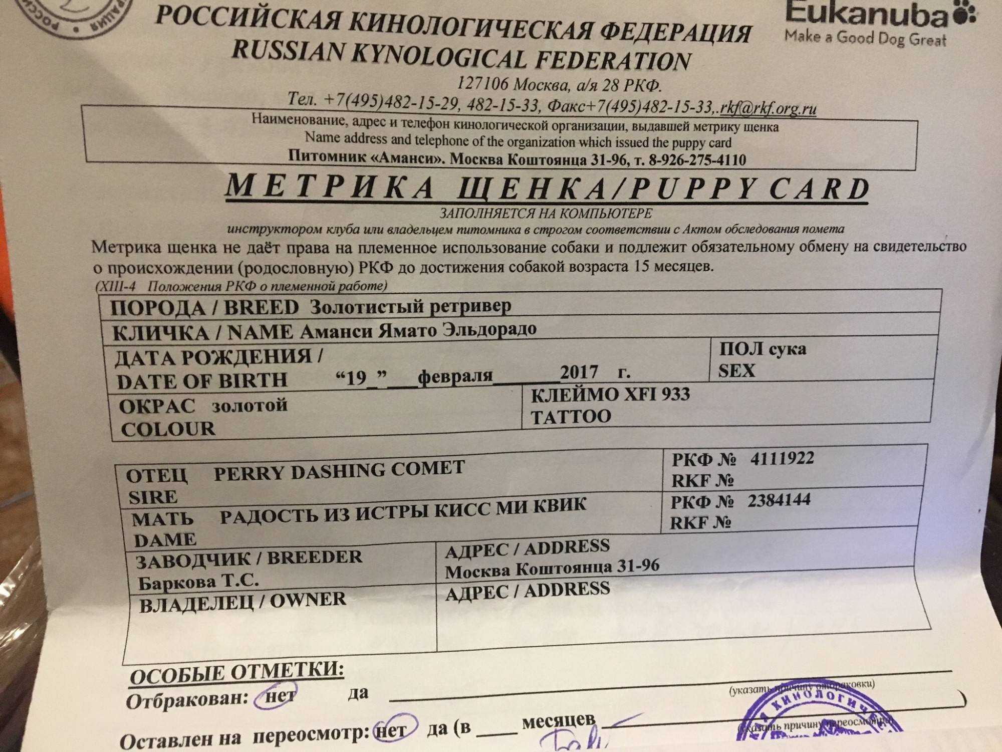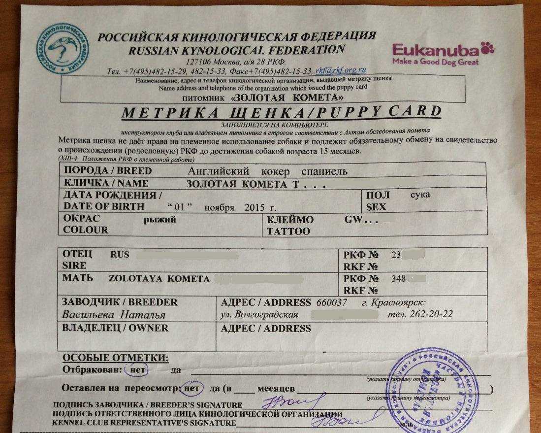 Часть первичной метрики отправляется на хранение в Российскую кинологическую федерацию, а другая остается у хозяина