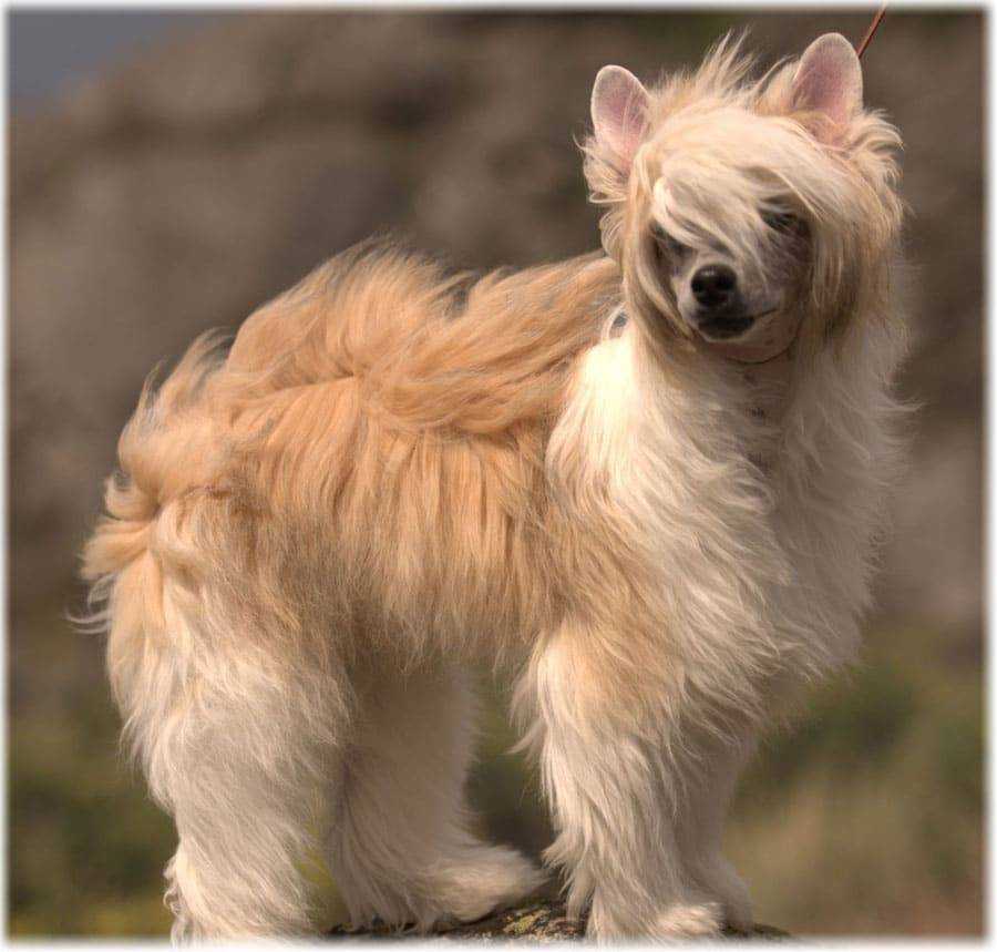 Пуховые китайские собаки, полностью покрыты шерстью, с виду напоминают маленькую Афганскую борзую.