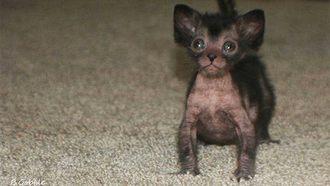 - редкая шерсть черного цвета по всему телу. Подшерстка почти нет. Имеется длинный остевой волос (редкость для кошек);