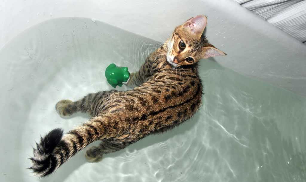 Стрижка когтей входит в перечень обязательных процедур. В некоторых случаях выполняют лазерное удаление когтей на передних лапах. Саванны не боятся воды и с удовольствием устраивают заплывы в ваннах и бассейнах.