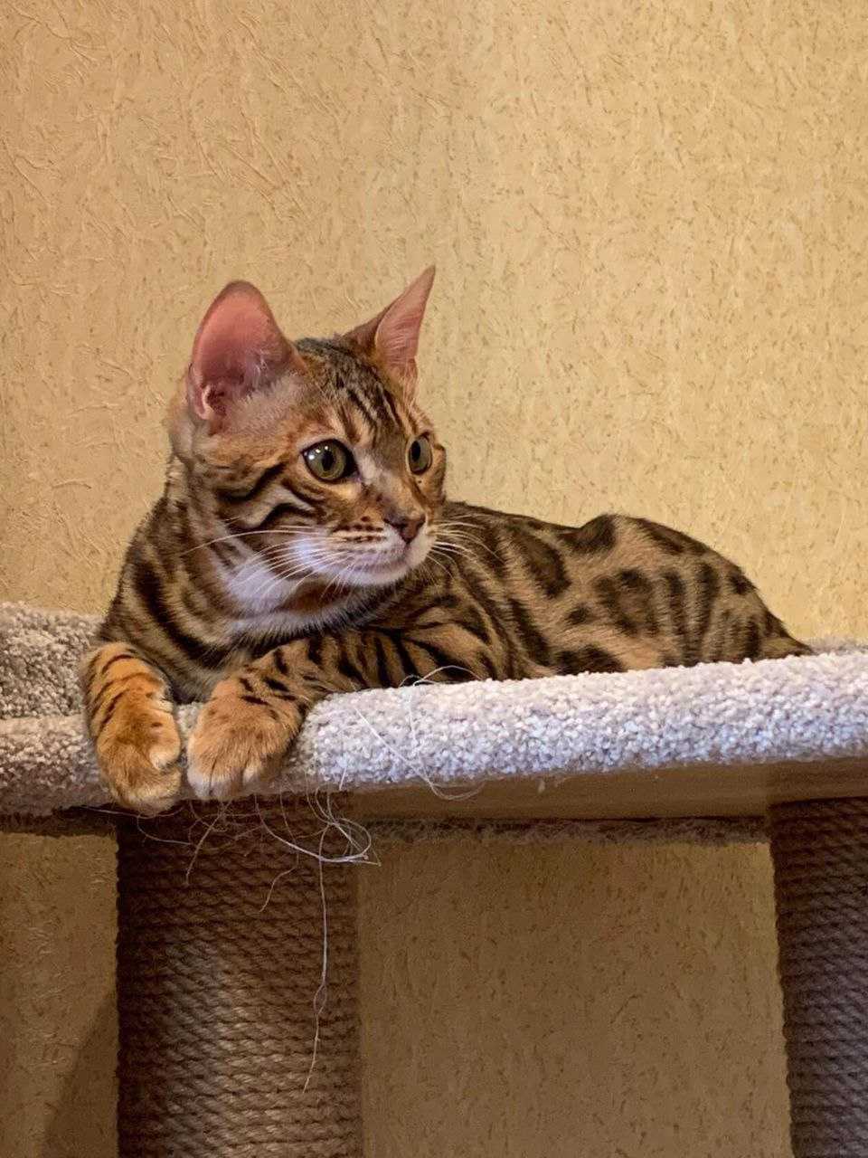 Бенгалы весьма подвижны и задорны, поэтому желательно купить животному специальный комплекс, в котором он будет бодрствовать и спать. Не забыть нужно и о когтеточке.