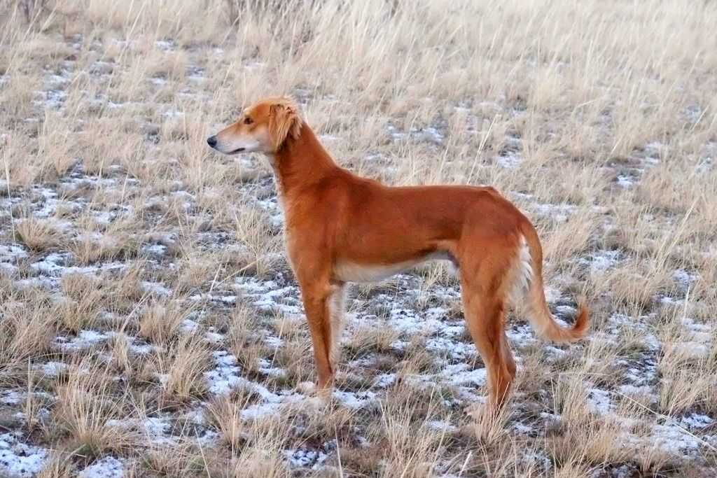 Казахская борзая – это собака среднего роста с сухим видом строения туловища. В области бедер и поясницы тазы имеют отлично развитую мускулатуру. Рост половозрелого кабеля не превышает 70 см. Голова борзой длинная, губы тонкие, уши посажены на уровне глаз. Мочка носа темная, может быть и коричневая. Глаза выразительные и большие. Хвост длинный и в конце закрученный. Вес половозрелой тазы достигает 35 кг.