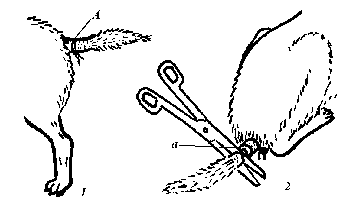 - Хирургический. Единовременное обрезание хвоста в возрасте 3-7 дней скальпелем или другим подходящим хирургическим инструментом с последующим наложением швов или без них.