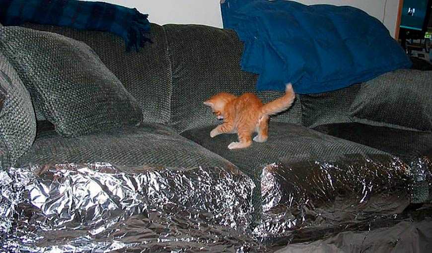 Также можно прикрыть привлекательные для кота участки алюминиевой фольгой или пупырчатой упаковочной пленкой. Она отталкивает животное из-за того, что в ней застревают когти. При этом они издают неприятные для кота звуки.