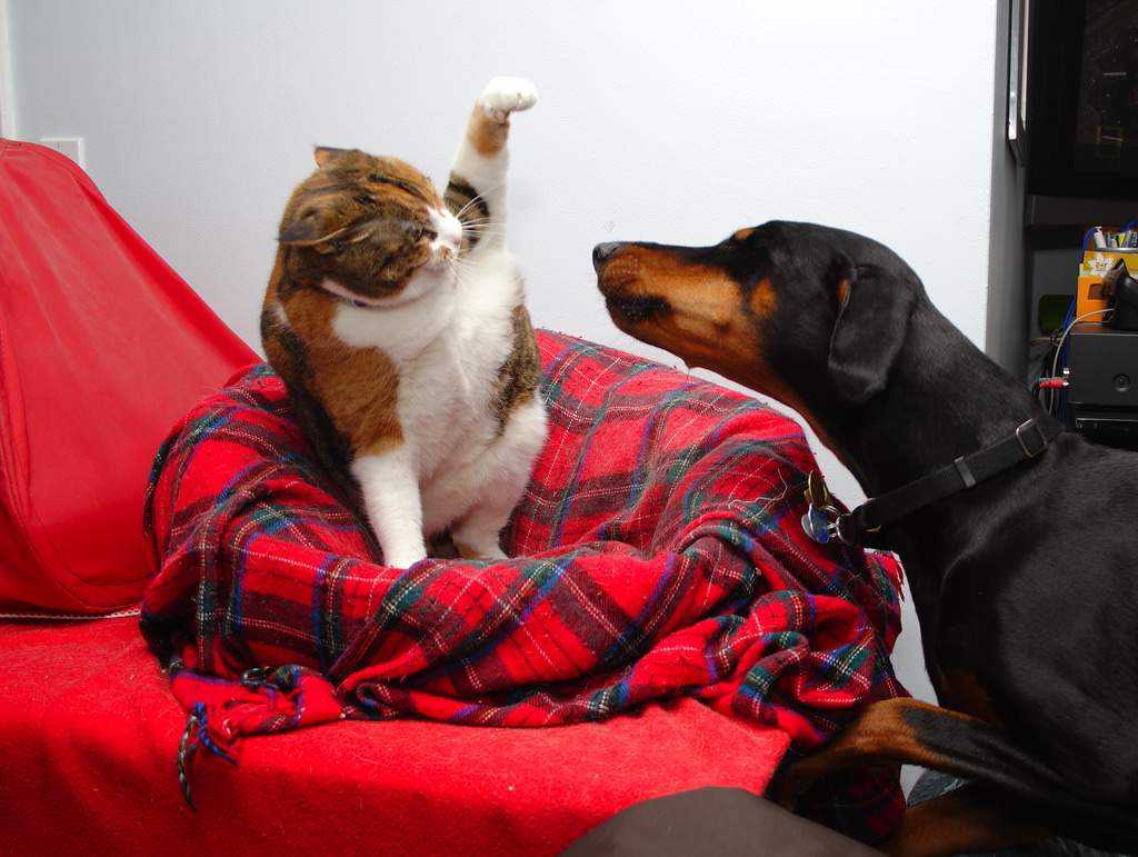 Разница в способах коммуникации. Эти животные прохладно относятся друг к другу, потому что разговаривают на разных языках и по-разному демонстрируют свои эмоции. Виляние хвостом, например, говорит о том, что пес пребывает в хорошем настроении. Этот же жест у кошки следует расценивать как выражение беспокойства, агрессии или готовности к атаке.