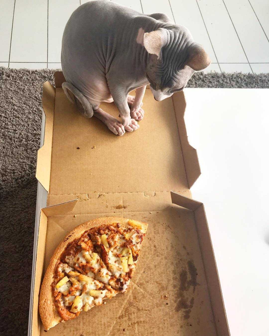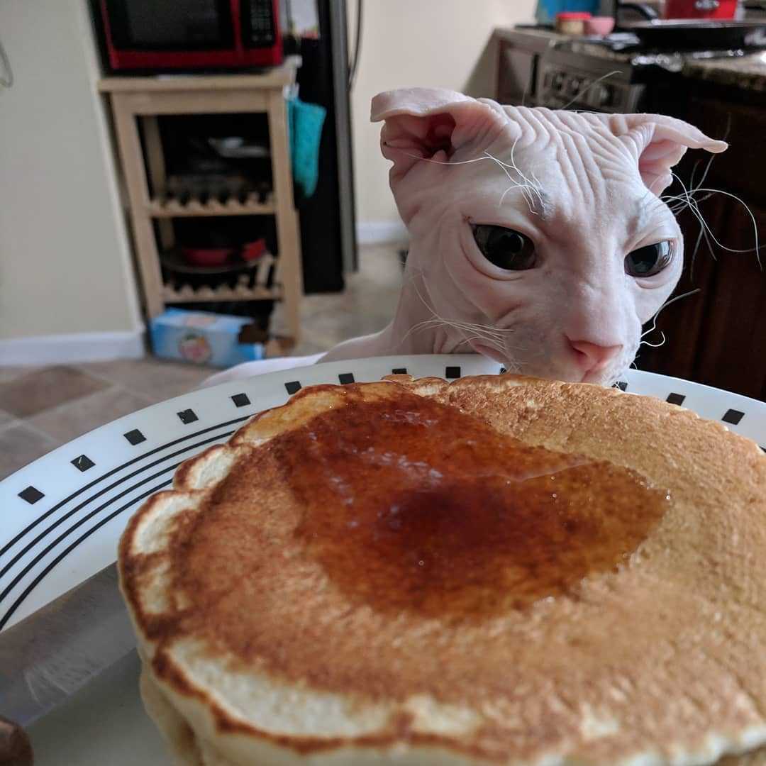 Сфинксы тратят огромное количество энергии на обогрев тела. Возможно, поэтому они такие прожорливые. Эти коты не только с аппетитом съедают корм в миске, но и требуют еще. Лысошкурое чудо без зазрения совести покусится на любую еду, оставленную без присмотра. Отучить сфинкса лазать по столам будет нелегко.