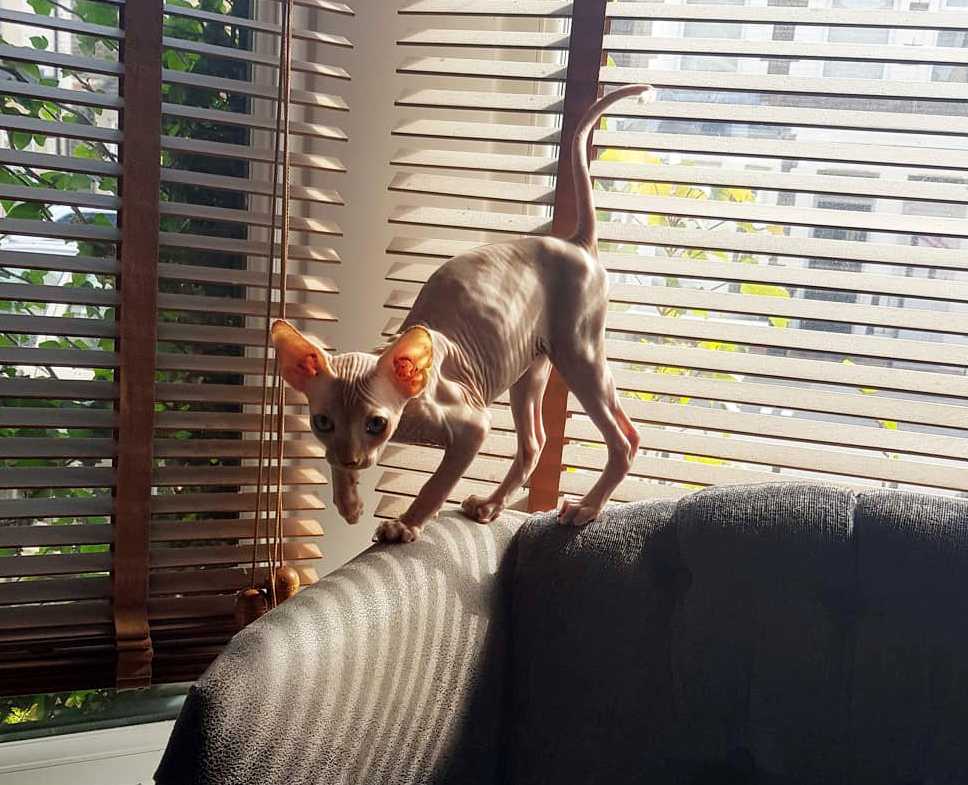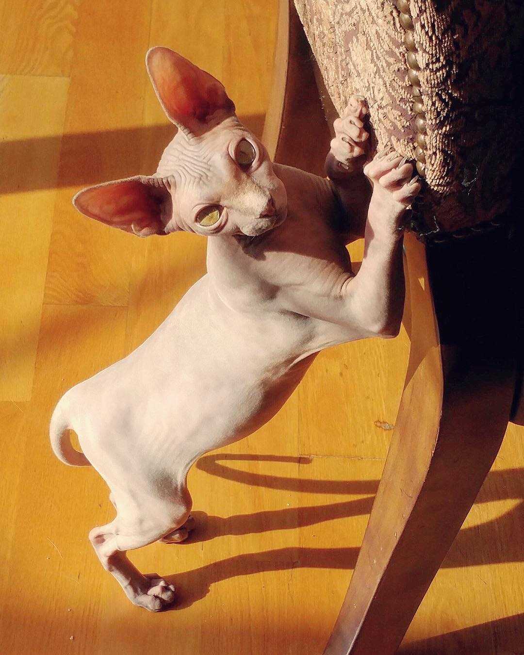Сфинксы относятся к довольно активным кошкам. Они не такие реактивные, как абиссинские кошки или корниш-рексы, но в молодости хулиганят не меньше. Проблема в том, что голые кошки не подходят для выгульного содержания, а в квартире могут скучать.