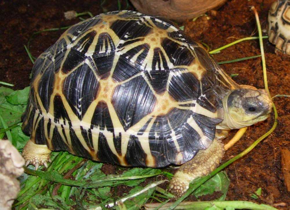 Обладательница удивительного панциря неправильной формы ярко-коричневого оттенка с желтыми полосами, рисунок которых напоминает лучи звезд. Не вырастает более двадцати пяти сантиметров.