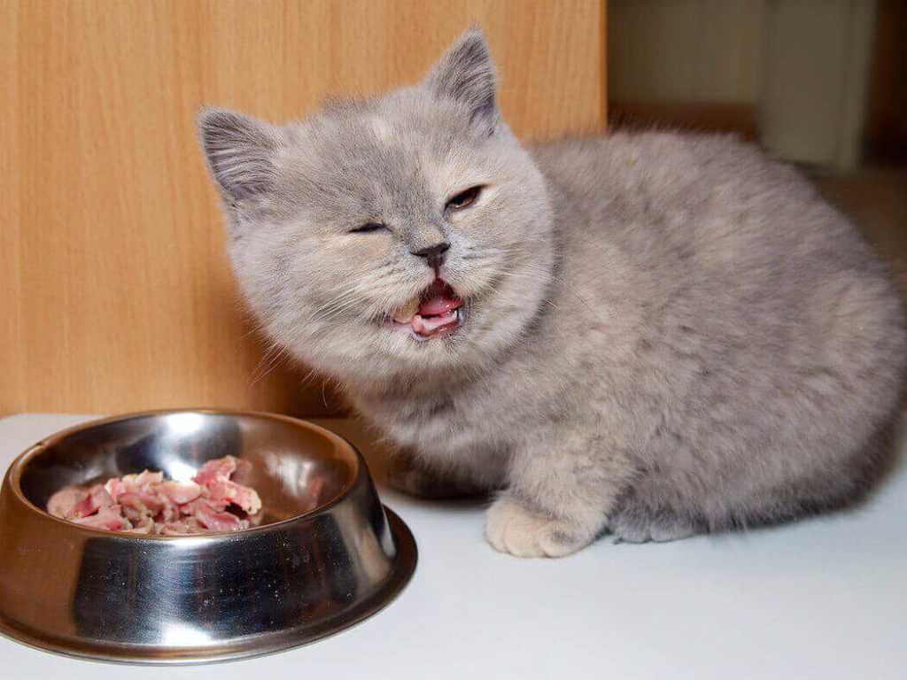 По сути, кошки — хищники, поэтому естественной пищей для них является мясо. Начиная с возраста полутора месяцев можно вводить в рацион животные продукты. Однако делать это необходимо постепенно. Мясо следует порезать на маленькие кусочки и отварить в течение 10−15 минут без добавления соли и других специй, а затем остудить. Некоторые предпочитают измельчать его до пюреобразного состояния. Также можно использовать в роли мясного прикорма детское пюре в банках.